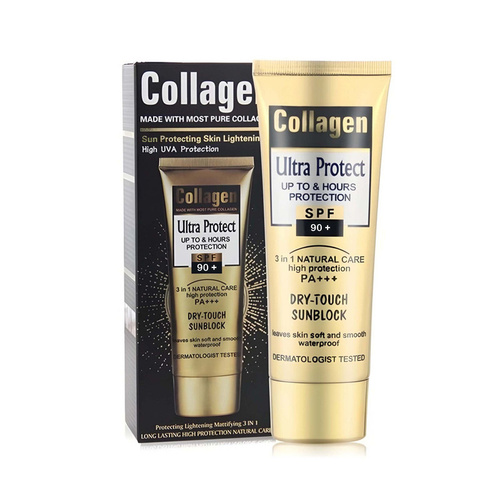 کرم ضد آفتاب بدون رنگ کلاژن spf90 مدل Ultra Protect محافظت کننده در برابر اشعه UVA و UVB مناسب برای انواع پوست حجم 100 میلی لیت